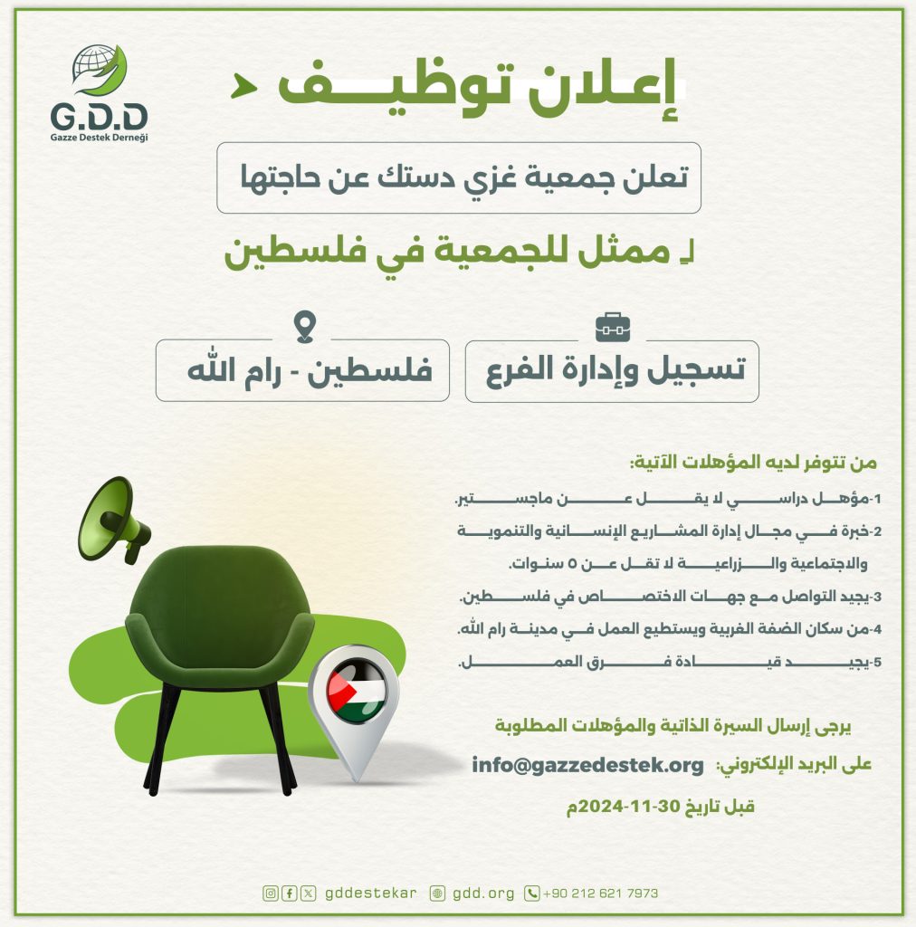 بحيث يتم إرسال السيرة الذاتية والمؤهلات المطلوبة على البريد الإلكتروني: info@gazzedestek.org قبل تاريخ: 30-11-2024م.